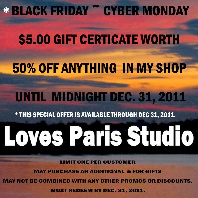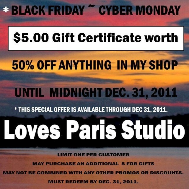 Black Friday 5 Dollar Gift Certificate, 50% off Any Item in my Shop, Valid until Dec. 31, 2011